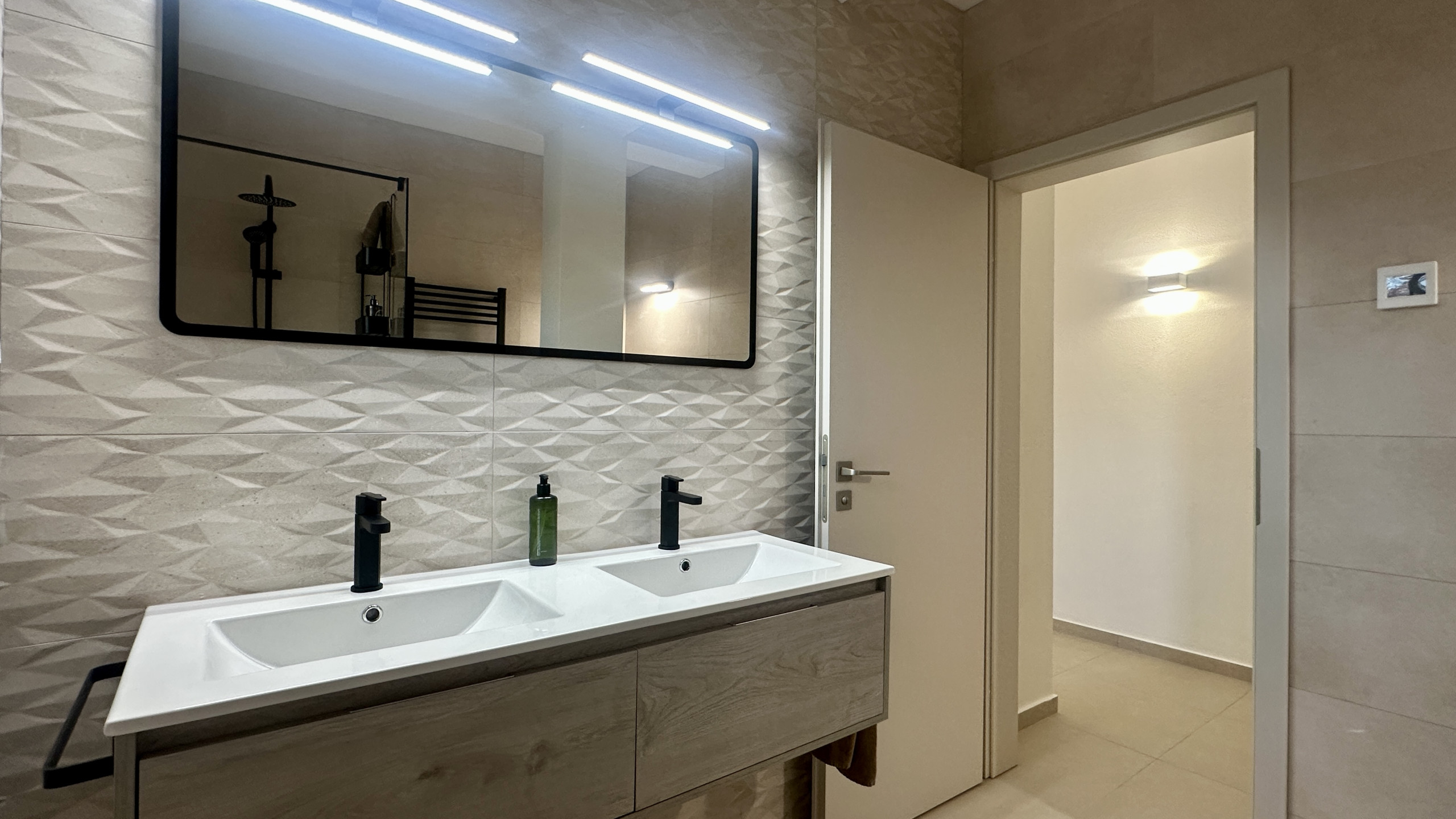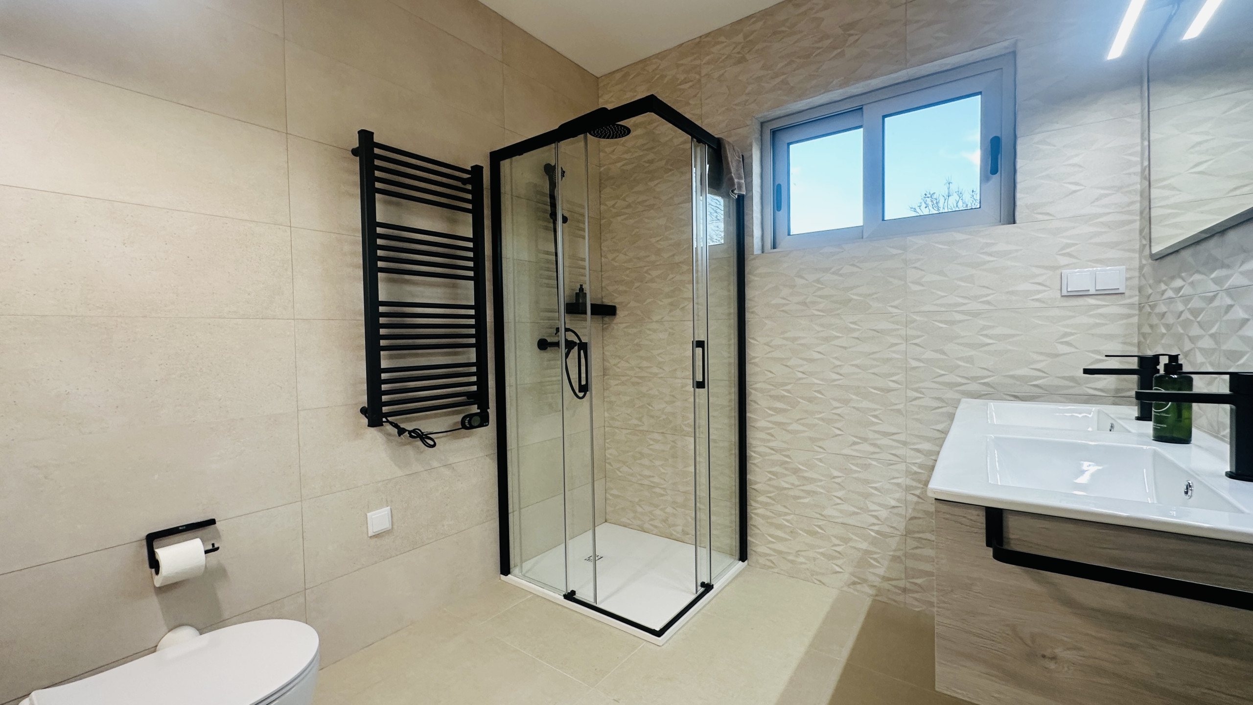 Modern und ausgestattet mit Geschirrspülmaschine, Waschmaschine, Kombi-Kühlschrank, Herd, Dunstabzugshaube, Mikrowelle, Wasserkocher, Dolce Gusto Kaffeemaschine, Toaster, Entsafter und Heißluftfritteuse
