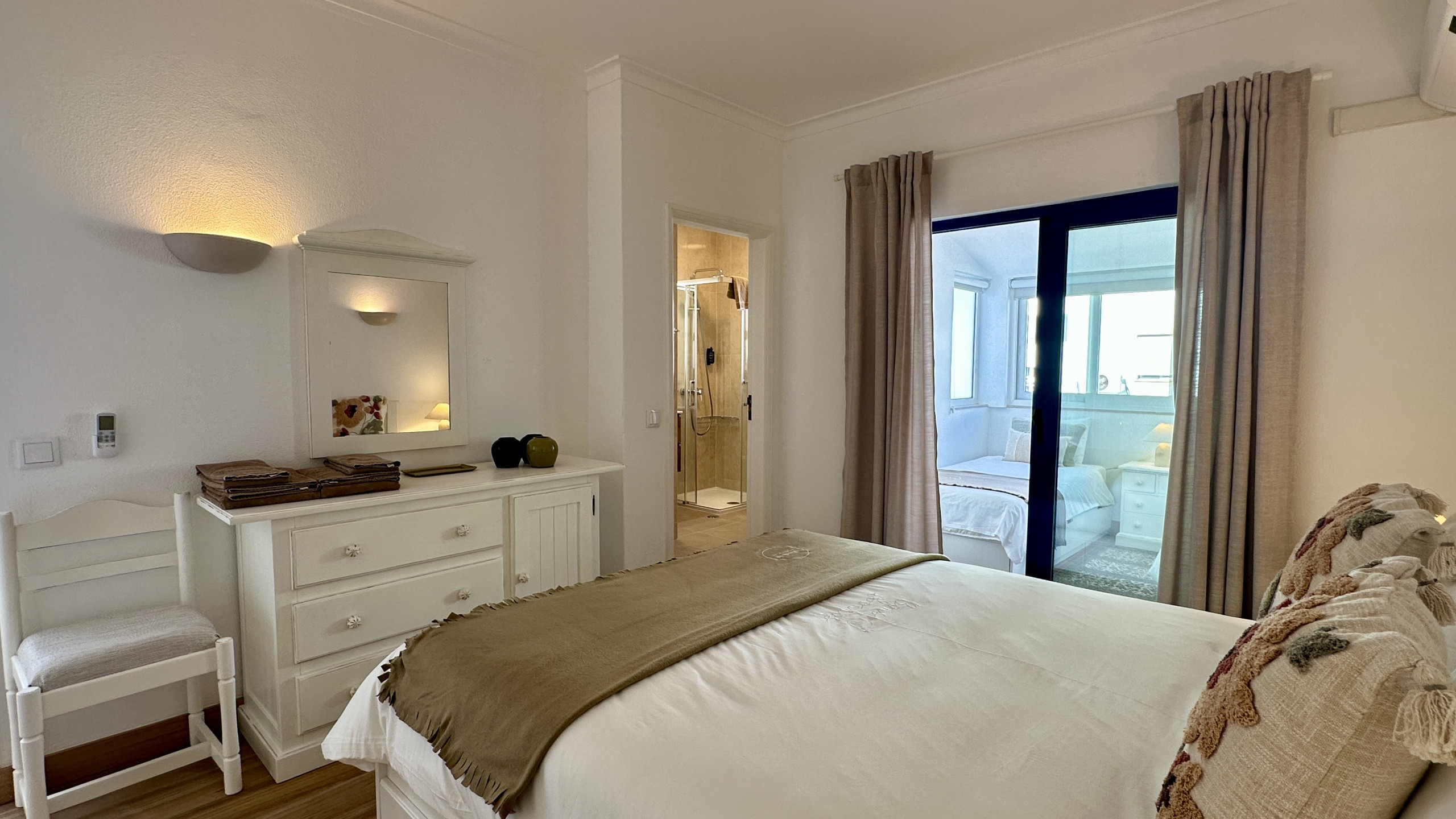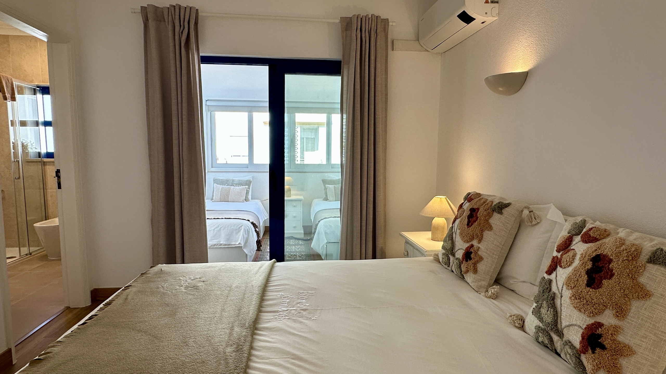 QUARTOS: um quarto em suite com cama de casal com acesso a outro quarto com duas camas de solteiro e outro quarto em suite com cama de casal.
